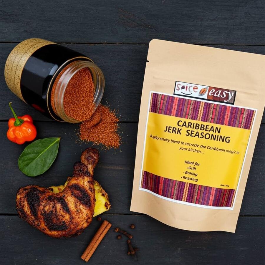 (Image Alt Text for SEO: Spiceneasy Authentic Jamaican Jerk Seasoning in jar next to grilled jerk chicken and fresh ingredients)