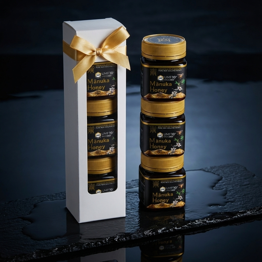 Presenting our most sought-after honey, reserved for those who seek the finest. This gift box holds three 110g jars of Mountain Gold Manuka Honey with a potent 10+ UMF rating. Sourced from the most remote, untouched regions of New Zealand, this honey offers a deeper, more complex flavor and enhanced properties. The ultimate gift for the connoisseur, the health-conscious, or as a superlative corporate present.