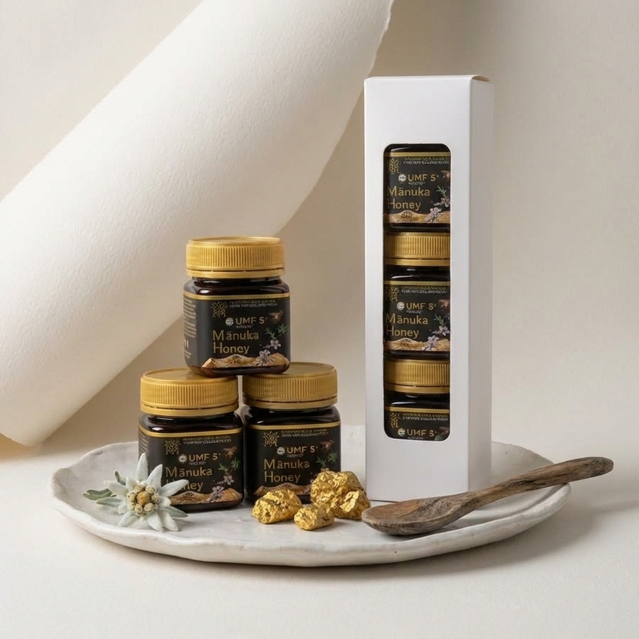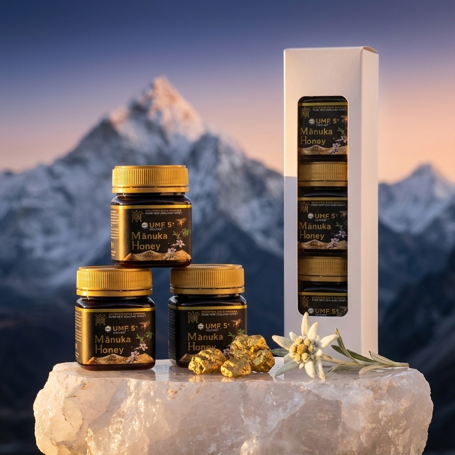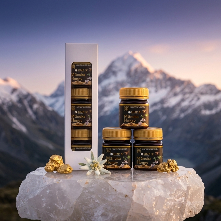 This is the perfect introduction to high-quality Manuka honey. Our gift pack includes three full 110g jars of Mountain Gold Manuka Honey with a guaranteed 5+ potency (MGO 83+). Enjoy the rich, distinctive flavor and unique texture. Whether for yourself or as a prestigious gift, this trio offers excellent value and a genuine taste of New Zealand's unique native flora. Presented in a handsome box, ready to give.