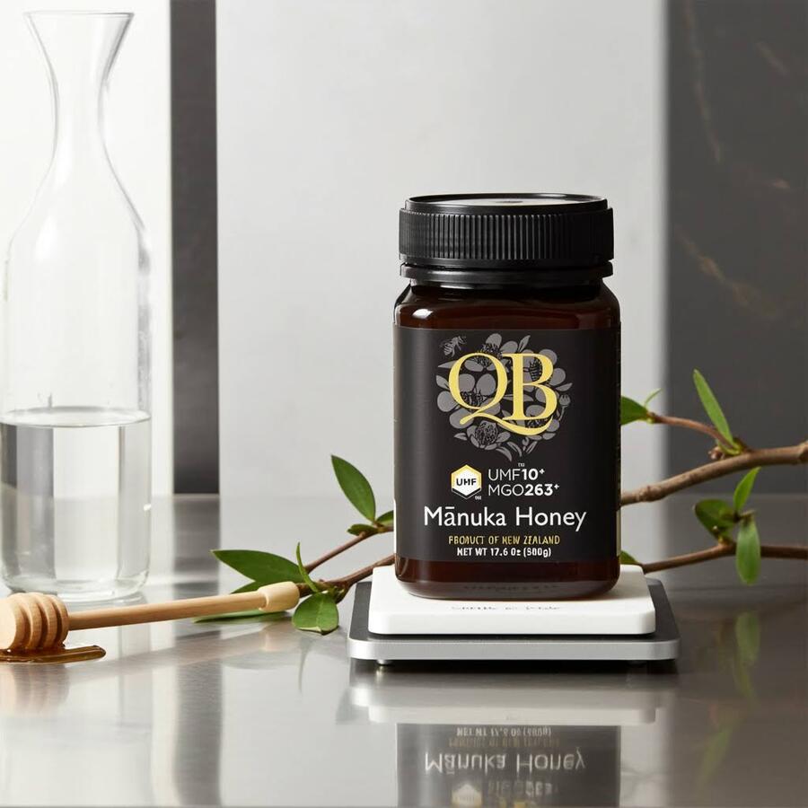 QB Mānuka honey is produced from the nectar of the Mānuka flower found amongst wild coasts and remote native forests of New Zealand. The UMF™ grading system measures four unique signature compounds – Leptosperin, DHA, MGO and HMF and provides assurance for quality .